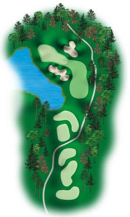 A well placed drive, along the right side of the fairway, gives you the best angle of approach and lets you avoid the tall fescue waste areas on the left. Be conservative on your second shot: the target is small and there is an additional Lateral Hazard area behind the green. Again, you have to be strategic. It’s not a long second shot, but you need to be in the fairway to make it your best.