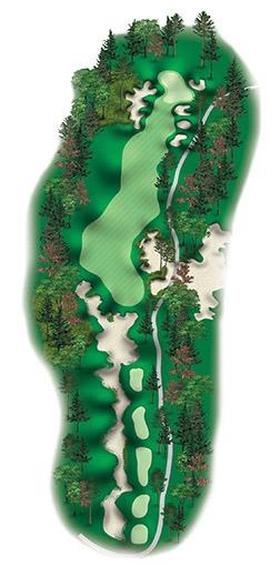 The green is long, two-tiered and surrounded by bunkers. Depending on pin location, your second shot must be well-placed and carry deep into the green, to avoid a very long putt.